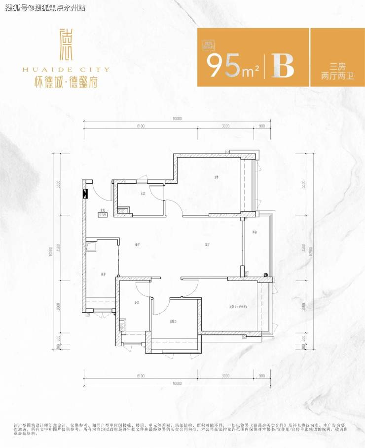 95㎡ 3房2厅2卫(B户型)设计的是竖厅双龙抱珠格局,进门独立入户玄关,客厅3.5米开间,主卧3.3米的宽度,其它2个次卧2.8米/2.6米的宽度,L型厨房,卫生间干湿分离设计。