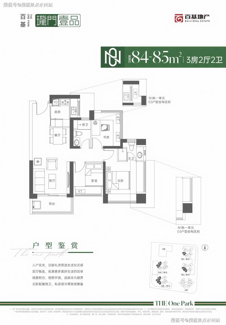 84-85㎡的3房2厅2卫,设计的是经典竖厅格局,进门入户玄关,客厅3.5米开间,LDKB一体化设计,动静分区,主卧+1个次卧270°飘窗,U型厨房,卫生间干湿分离,得房率:71.29%(不含赠送),西南或西北朝向。