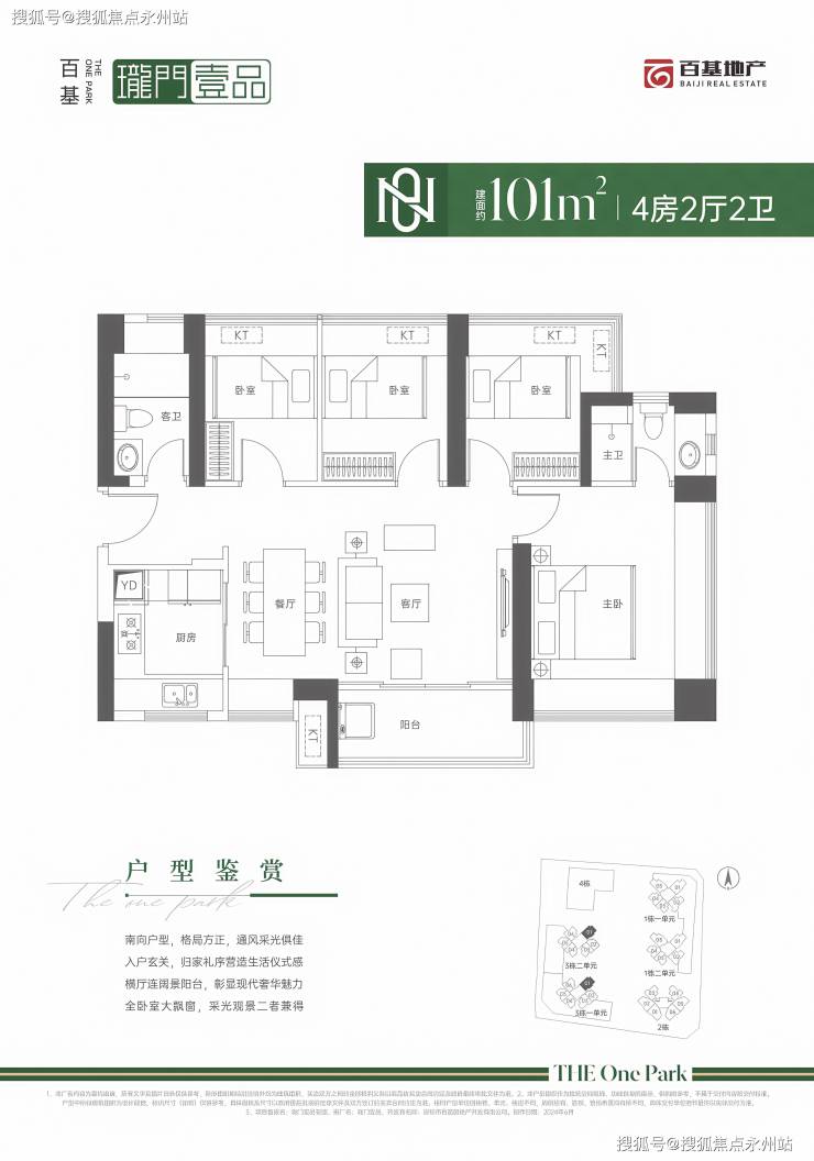 101㎡的4房2厅2卫,设计的是横厅南北通透格局,进门入户玄关,客餐厅5.55米开间,LDKB一体化设计,四开间朝南,4个卧室分别做到了3.85米/2.6米/2.4米/2.35米的宽度,主卧270°双飘窗,U型厨房,卫生间干湿分离,得房率:71.29%(不含赠送),阳台主朝东南向。