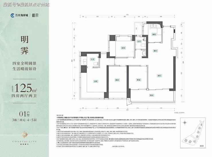 125㎡横厅四房:景观优势,东南朝向,约12米采光面,主卧 L 型飘窗享270°环幕视野,适合对景观有要求的家庭。