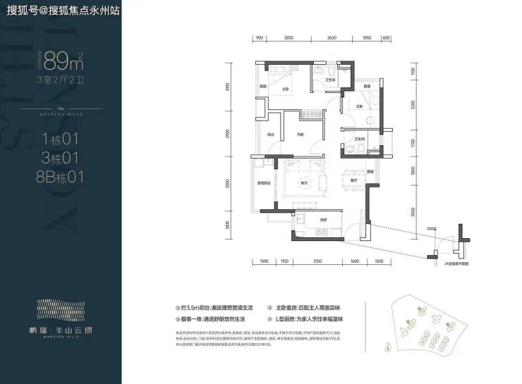 01户型:89㎡的3房2卫,设计的南北通透竖厅格局,客厅3.5米开间,三开间朝南,L型厨房,3个卧室做到了2.9/3.2/3.1米的宽度,阳台主朝西南向。