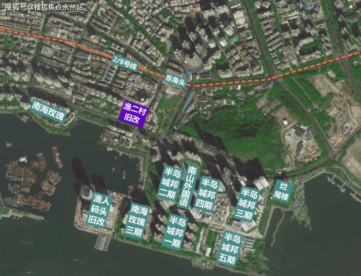 项目周边属于蛇口老城区,有不少城中村,城市面貌相对老旧。附近的东角头地铁口聚集了多个项目——渔人码头改造、蛇口油库搬迁等。渔二村项目整体规模不大,定位上相较于豪宅线的顶级项目,接地气得多。