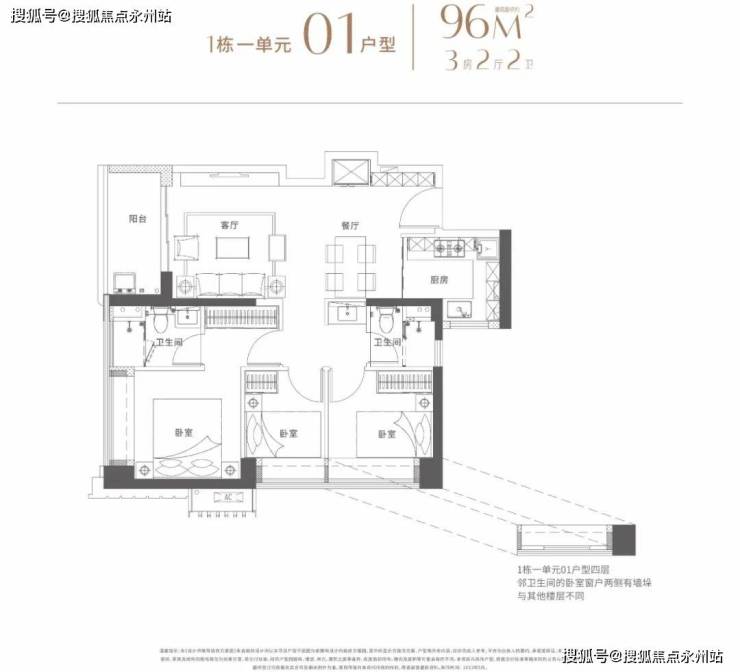 在售的1栋1单元 3T5户,01/02户型96平米3房2卫西北朝向,03户型119平米4房2卫西北/东南通透户型,04/05是99平米3房2卫西南朝向。