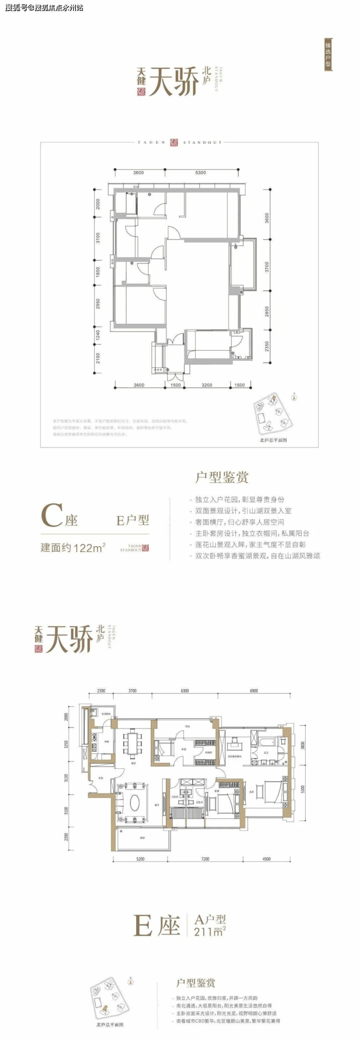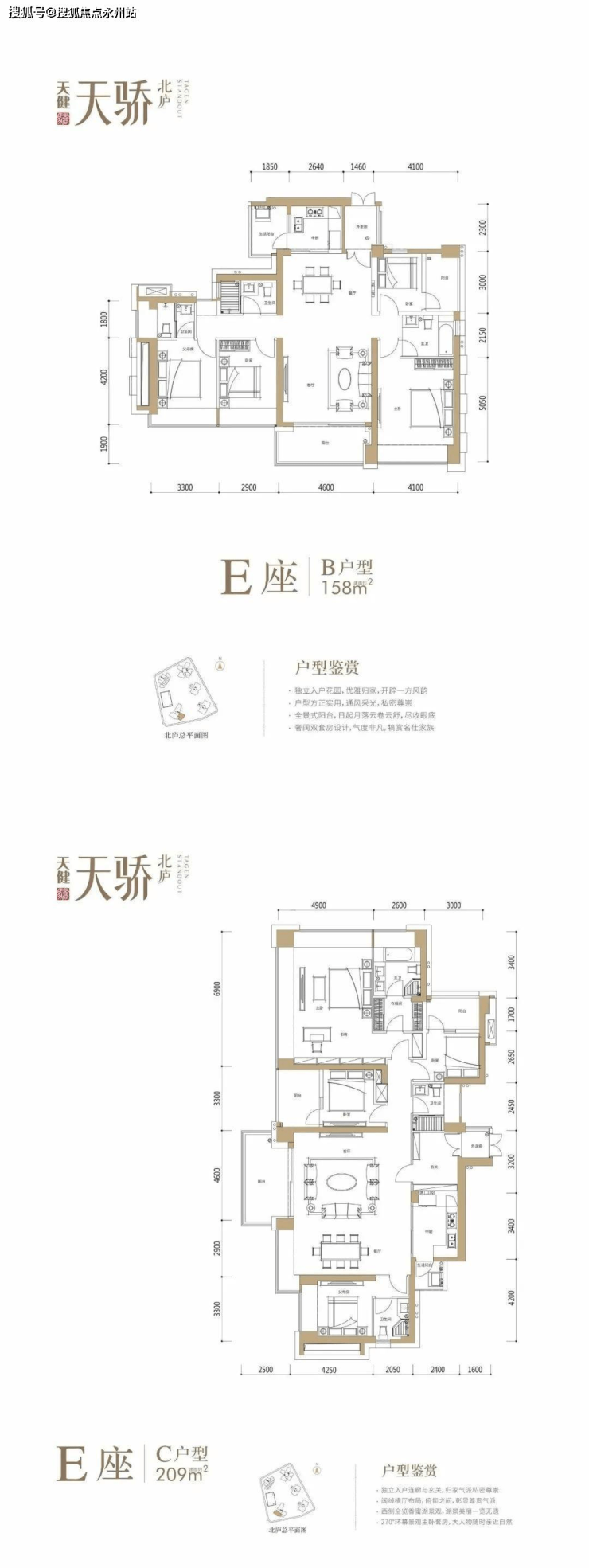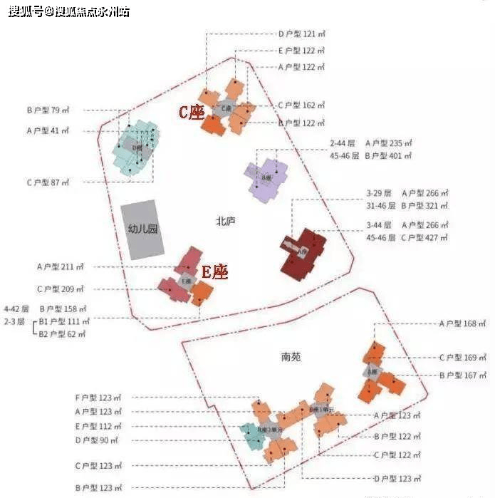 1栋E座44层 共123户,朝南为主,三梯三户,158-209-211平。