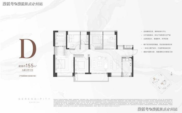 155㎡的5房2厅2卫,设计的是横厅南北通透格局,客餐厅6.6米开间,客厅连接次卧出大阳台,五开间朝南,5个卧室分别为3.9米/3米/2.8米/2.8米/2.7米的宽度,U型厨房,公卫三段式分离,得房率:76.87%(不含赠送),阳台主朝东南或西南向。