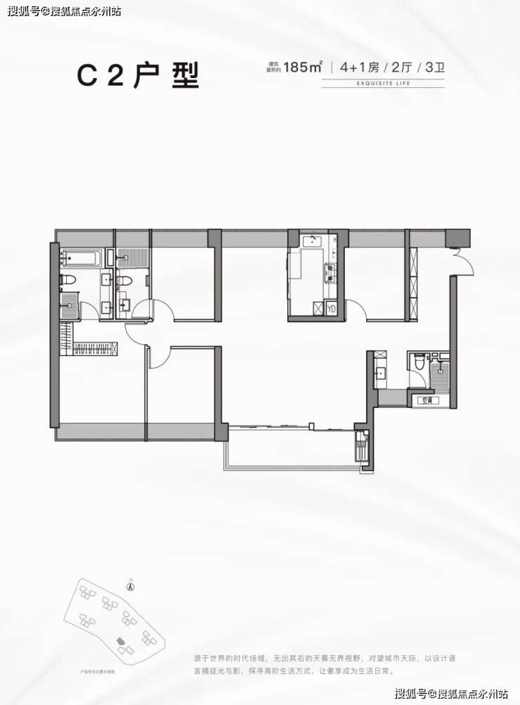 177㎡的4房2厅3卫,楼王单位,3梯3户,设计的是竖厅双龙抱珠格局,超大方形客厅,设计有2个独立套房,U型厨房,得房率:77.43%(不含赠送),西南朝向。