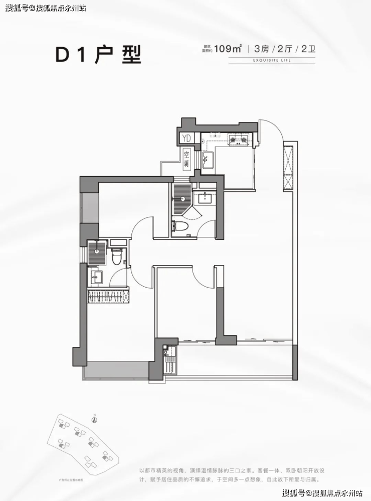 109㎡的3房2厅2卫,设计的是竖厅格局,餐客厅一体化,动静分区,三开间朝南,L型厨房,得房率:70.53%(不含赠送),客厅连接卧室出大阳台,西南朝向。