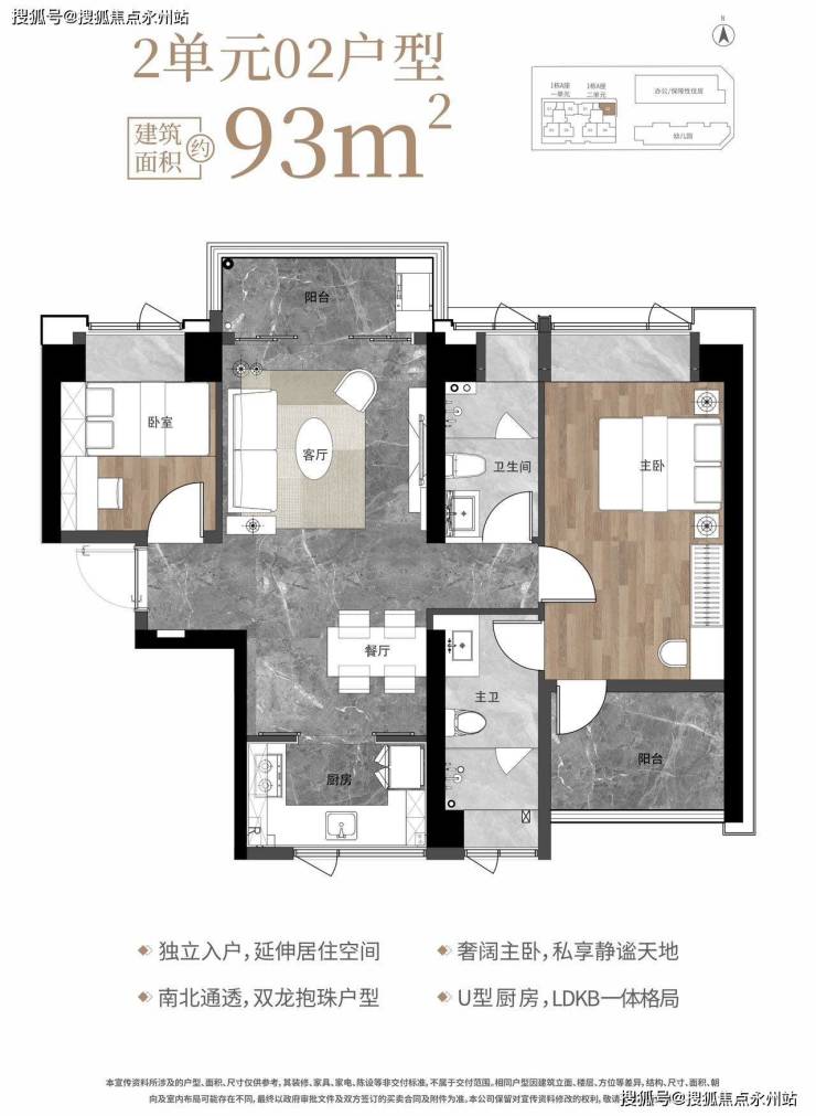 格局 A(1栋2单元02户型)南北通透,独立入户后,3.6米开间客厅与餐厅分离,U 型厨房外接北向生活阳台,主卧套房含独立卫浴(干湿分离),适合注重隐私的家庭。
