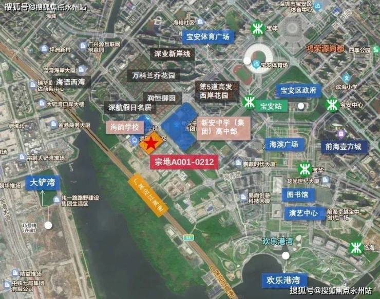 该地块位于宝安宝中片区,金科路与罗田路交汇处西南侧,北面是海韵学校、深航福利房深航假日名居,西面就是大铲湾,南面是湾区产业投资大厦,东面为新安中学(集团)高中部。