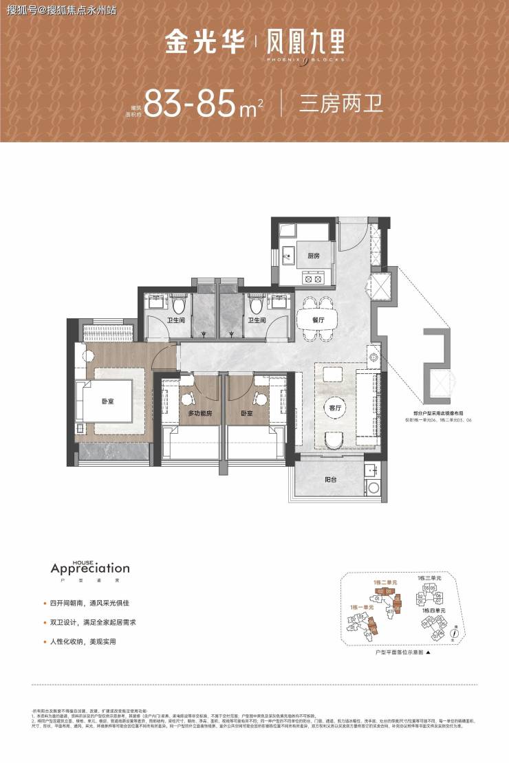 83-85㎡户型3房2厅2卫:竖厅格局,四开间朝南,主卧双窗户南北对流,U型厨房,有西南朝向及东南朝向。是项目明星网红户型,是对生活品质有更高追求的改善型家庭的置业首选!