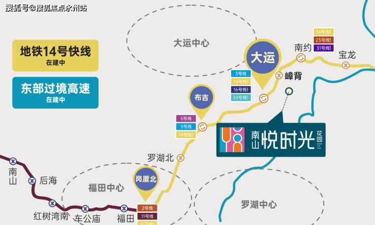项目距离14号线嶂背站约1.4km,1站即可抵达大运枢纽站。待14号线通车之后,从项目出发,8站即可抵达福田,仅需30分钟就可以直达福田中心,未来通过14号线的6大枢纽换乘还可以快速通往深圳各个中心区。