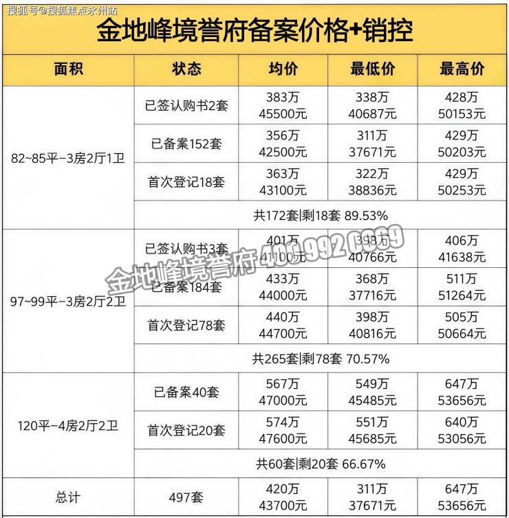 项目于去2024年4月份的时候也是有进行备案价格调整,目前实际的备案均价是4.37万/m²,备案单价3.76-5.36万/m²,总价在311-647万/套。面积有83-85m²的3房2厅1卫,97-98m²的3房2厅2卫,120㎡的4房2厅2卫户型,共497套房源。