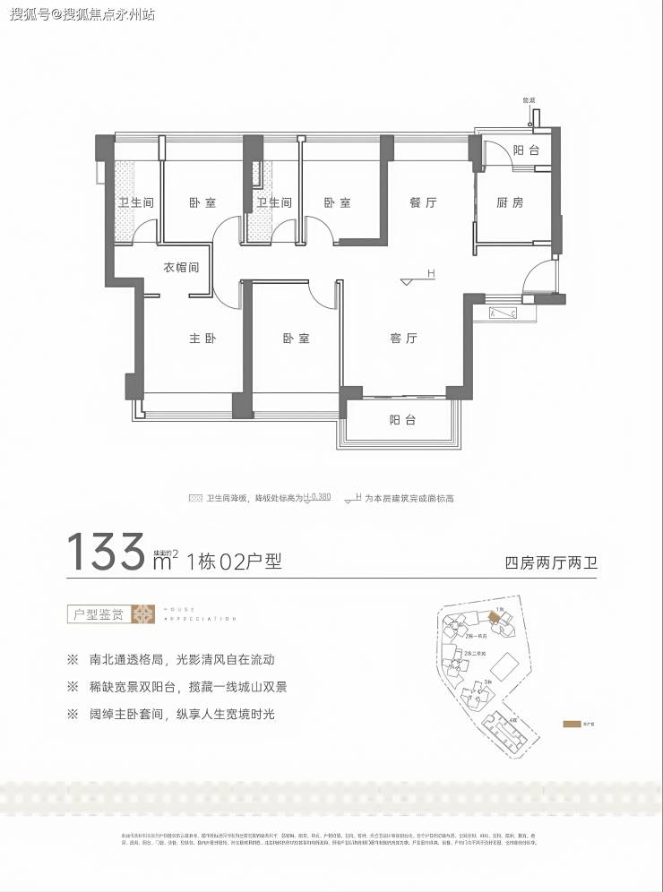 133㎡的4房2厅2卫,设计的是竖厅南北通透格局,进门独立玄关,客厅3.55米开间,三开间朝南,4个卧室分别做到了3.5米/3米/2.75米/2.7米的宽度,主卧大套间设计,U型厨房,还带1个小生活阳台,得房率约74.8%(不含赠送),客厅阳台主朝西南向,看花园景观。