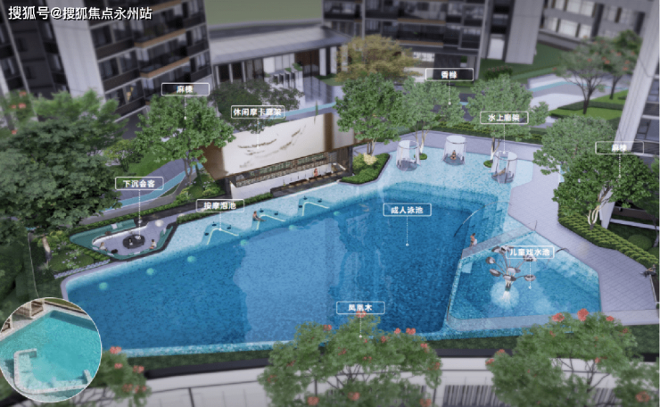 社区内还打造了无边界的望山泳池,位于整个园林的中轴位置。