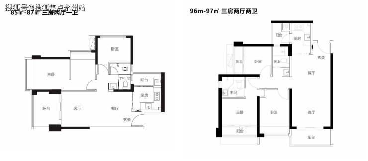 建筑面积约85㎡-87㎡户型:双面采光,室内通风采光性能良好,功能全面。次卧紧凑实用。三分离卫生间,实用性能良好。餐厨空间紧凑独合理,带有独立生活阳台。