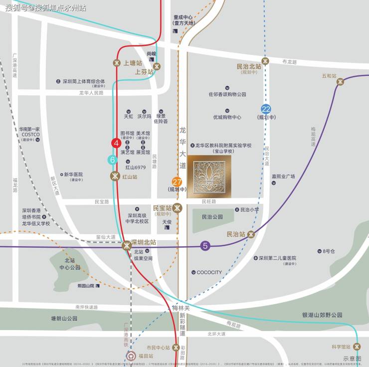 深圳北站高铁枢纽、地铁4/5/6/22/27号线(规划中)五轨交汇,五横六纵多维立体路网无界城心繁华。