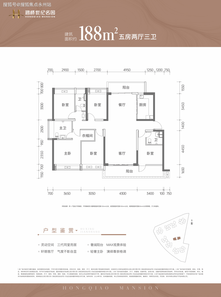 建面约188㎡5房2厅3卫:终极改善户型,南北双阳台,多套房配置,家族式居住典范。
