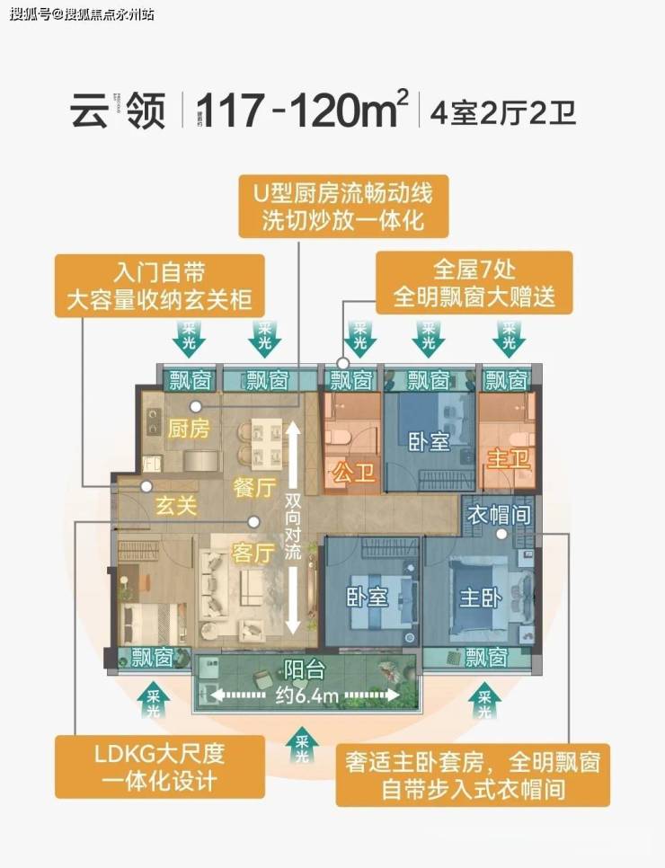 经典款:117㎡四房:四开间朝南,采光面达约12米,双开间阳台(约6.4米)连通客厅与次卧,兼顾晾晒与观景功能,主卧套房配备 L 型衣帽间,次卧与书房相邻,适合二胎家庭。
