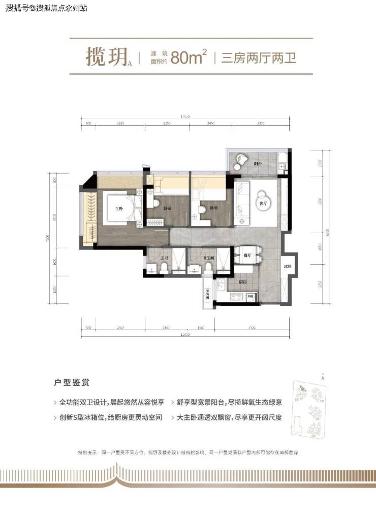 空间效率革命:80㎡三房两卫的刚需教科书,堪称深圳刚需市场的"空间压缩术"典范。在新规支持下,该户型通过精准的尺度把控,实现了95-101%的超高使用率,远超市场同面积段产品80%左右的平均水平。采用经典竖厅格局,3.3 米的客厅开间虽不算阔绰,但通过 LDKB(客厅、餐厅、厨房、阳台)一体化设计,形成了视觉上的空间延伸感,让小户型也能拥有通透的公共活动区域。