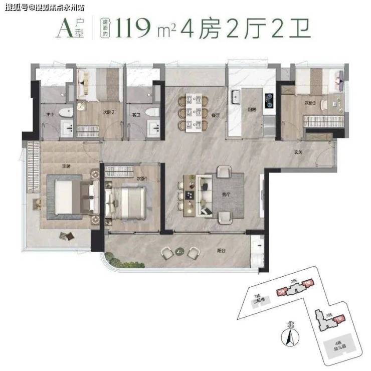 119㎡A户型为南北通透的常规四房,进门的第一个房有点小,要睡人必须搭窗台,不过用作书房是很爽,跟睡房隔离开。客厅开间大,结合大阳台设计,整体也是三面采光。