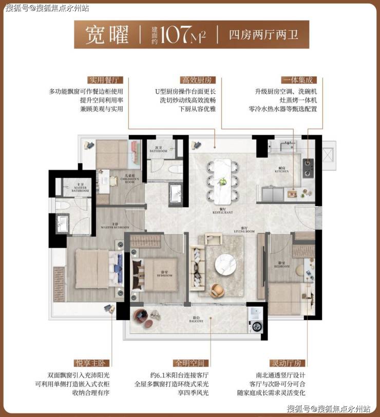 飘窗收纳系统:全屋飘窗均为齐平设计,可嵌入定制柜体,增加约3㎡储物空间,解决小户型收纳痛点。