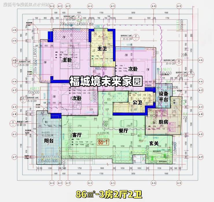 86㎡的3房2厅2卫,设计的是经典竖厅格局,进门入户玄关,客厅3.4米开间,LDKB一体化,S墙设计预留冰箱卡槽位,动静分区,三开间朝南,3个卧室分别做到了主卧13.52㎡/次卧9.34㎡/次卧8.11㎡(去掉墙体,包含飘窗),U型厨房,公卫三段式分离,还带1个设备平台,西南朝向。