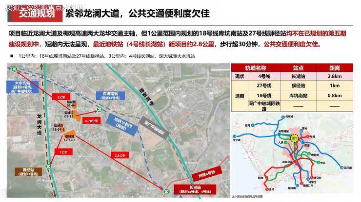 项目1公里范围内规划有地铁18号线库坑南站和27号线狮径站,未来可快速换乘至福田CBD,在建的地铁22号线一期(预计2028年通车)是贯通深圳中轴的南北快线,途经九龙山数字城,建成后福田至观澜仅需45分钟。目前最近的地铁4号线长湖站距离约2.8公里,可通过公交接驳(如M543路直达)。