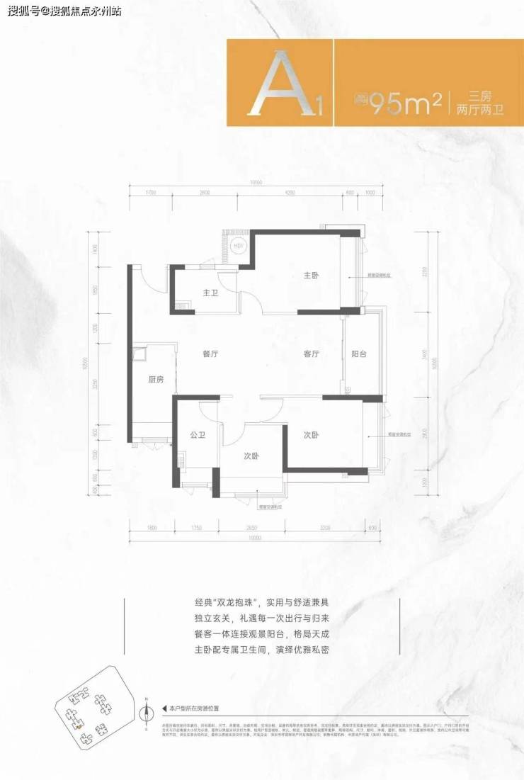 95平三房两卫:户型朝向东南向,比较方正。采用近似风车形设计——客餐厅在中间,各功能房间围绕四周布置。其弊端是围绕客餐厅的开口过多,使客餐厅承担更多交通功能,流线组织会比较困难,优点是减少了交通面积,空间利用率高。
