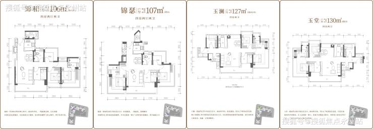 户型包含88㎡竖厅3房2卫,104-106㎡竖厅4房2卫,107㎡为双龙抱珠4房2卫,127-130㎡通透4房2卫。