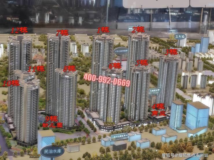 由12座建筑及裙房组成,其中10座32-47层住宅+1所幼儿园+1座商业裙楼,共1992户,配2155辆车位,容积率5.68。