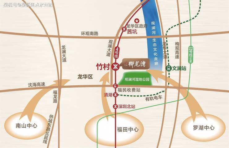 项目紧邻4号线竹村站D出口,是观澜方向进入龙华区的首站,步行约 3 分钟直达,7站至深圳北站(换乘5/6号线),13站至福田口岸,30分钟覆盖福田CBD、南山科技园等核心区域。