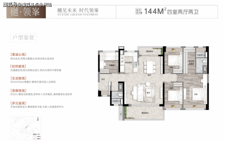 建面约144㎡4+1房2厅2卫:入户花园,入户玄关,带独立飘窗,四通透空间,南北双阳台,约34㎡超大餐客厅,约30㎡主卧套房带大衣帽间。使用率88%,加赠送93%。