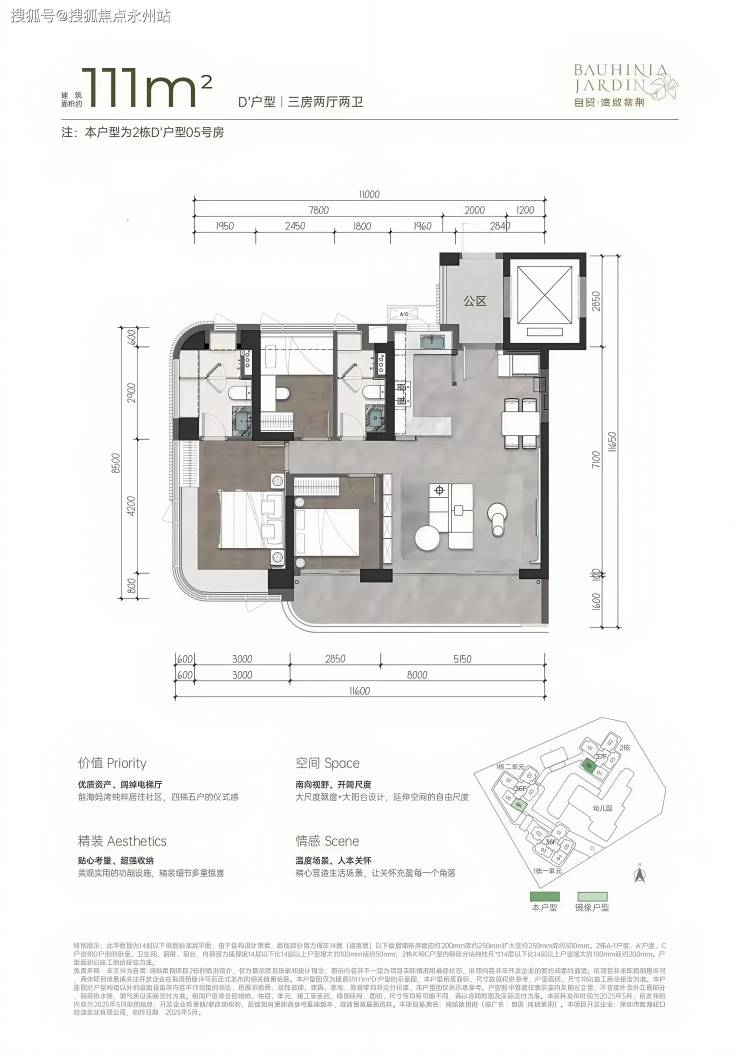 111㎡的3房2厅2卫,2栋05户型,设计的是竖厅格局,专梯入户有送约5.7㎡的独立公区,客厅5.15米开间,超宽客厅,LDKB一体化设计,动静分区,三开间朝南,主卧大套间无柱弧形270°转角飘窗,3个卧室分别做到了主卧17.64㎡/次卧9.12㎡/次卧8.57㎡(包含墙体飘窗),客厅连接次卧出8米长的观景大阳台,U型厨房,卫生间干湿分离,得房率约76.7%(不含赠送),西南朝向。赠送面积18.56㎡(不含公区),加上赠送后得房率约93.65%。