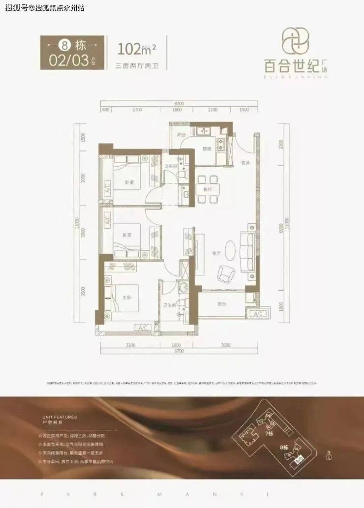 8栋102㎡的3房2厅2卫,设计的是竖厅格局,餐客厅一体化,客厅3.6米开间,3个卧室分别做到了3.3米/3米/3米的宽度,阳台1.6米进深,L型厨房,有带1个小生活阳台,都是东南朝向。