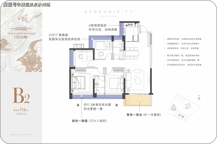 建面116平米:4房2厅2卫,传统的竖厅动静分区户型,分布在3栋的03/06户型,东南和西南两种朝向;唯一的不足就是厨房的空间有点小,其他各个空间比较均衡,客厅的开间3.7米,卧室的飘窗比较好利用,特别是比较小的次卧是 L 型的飘窗,采光、视野更好些。