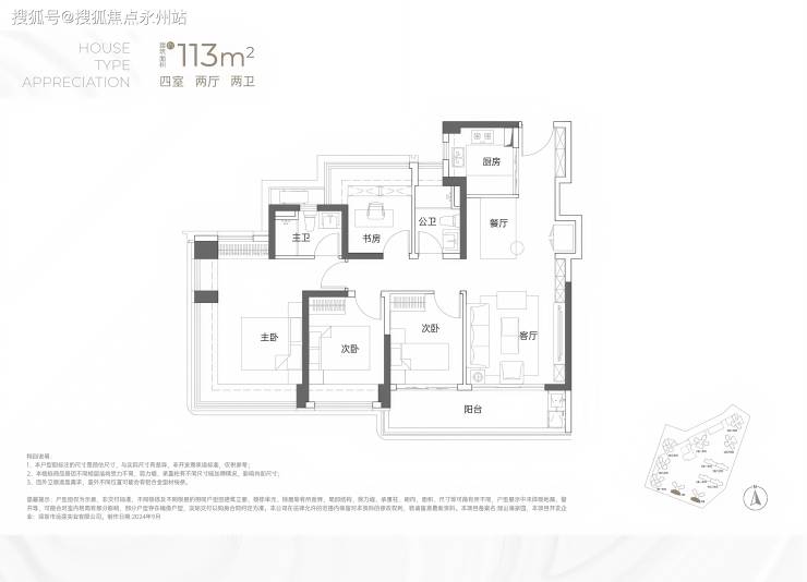 113㎡四房两卫竖厅(03/04户型)传统竖厅格局,客厅连接次卧出6.3米长阳台,主卧与书房飘窗延伸采光,270°观山飘窗为核心亮点,部分房源可无遮挡俯瞰山体。