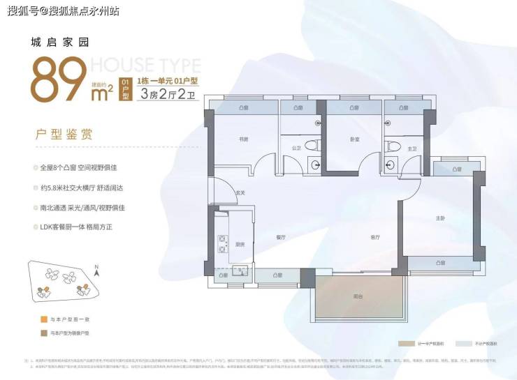 89㎡的3房2厅2卫,01.06户型,设计的是横厅南北通透格局,客餐厅5.8米开间,LDKB一体化,四开间朝南,主卧双飘窗南北通设计,L型厨房,卫生间干湿分离,阳台主朝西南或东南向。