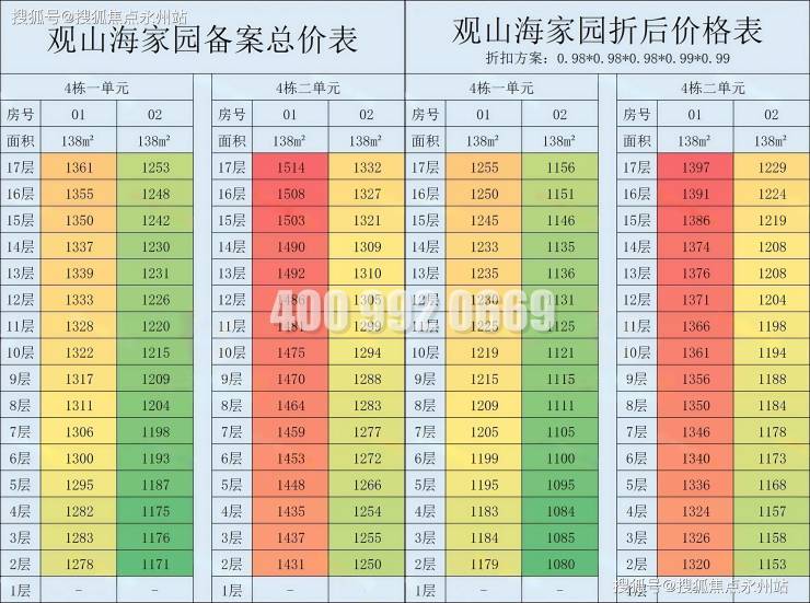 (折后)4栋1-2单元,开盘折扣与此前三批一致,也是综合约92折,折后单价8.85万,单价7.8万-10.1万,总价1080-1396万。