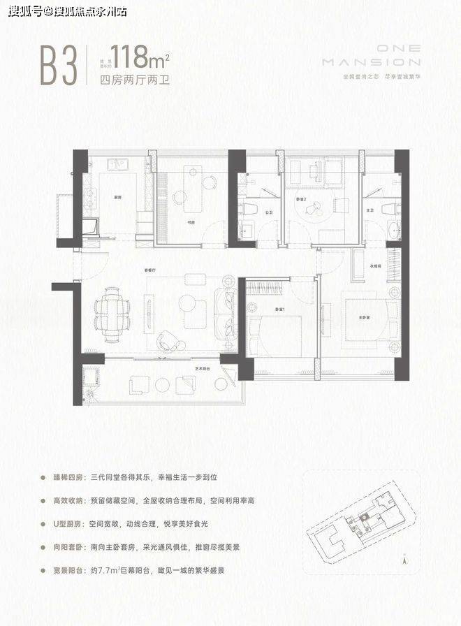 建面约118㎡的4房2厅2卫,拥有独立门户,是项目的“楼王”产品。四居室可以容纳三代同堂,各得其乐。南向大主卧套房,采光通风俱佳,推窗尽览美景;大宽景阳台足足约7.7m²,完全就是一个“多功能区”的配置,想要阳光房、玩具屋,还是茶室?都可以随心实现呦。