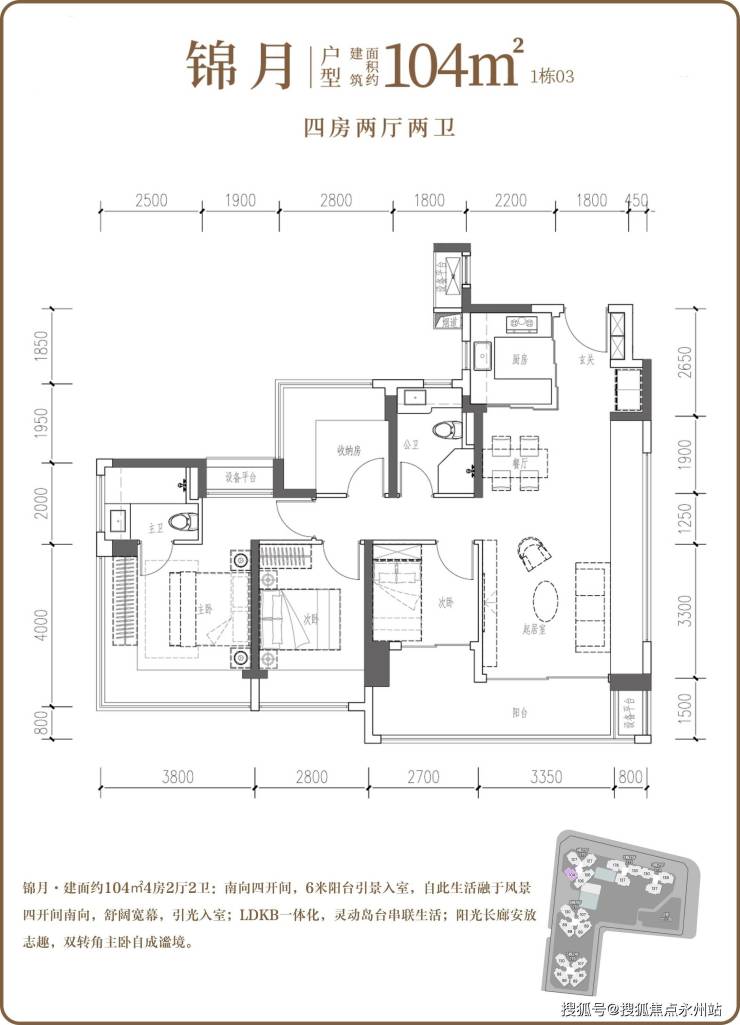 户型特点:竖厅格局,客厅面宽3.7米,四开间朝南设计,主卧 270° 无柱转角飘窗+设备平台(约1.52㎡)空间布局与 104㎡相似,但客厅开间略小,阳台面积约 11.76㎡,东南朝向。