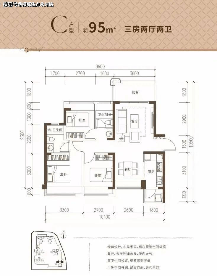 95㎡的3房2厅2卫,设计的竖厅南北通透格局,客厅3.6米开间,动静分区,L型厨房。
