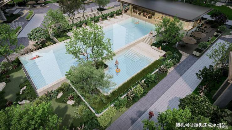 景观双轴,十大主题庭院:礼序前庭、琉光下沉式庭院、游泳池、社区会客厅、轻氧健身、亲子乐园、社区慢跑场等十大主题景观庭院。