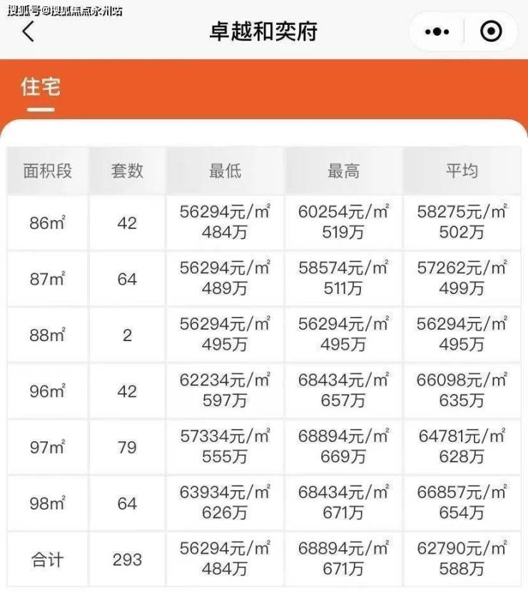 备案293套住宅房源,户型建面约为86-98㎡的3房,含精装均价约6.28万/㎡,单价区间约5.63-6.89万/㎡,开盘折后单价约5.1万/㎡起。