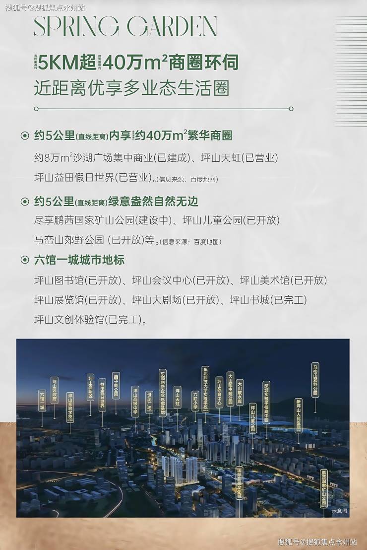 商业方面,5 公里范围内涵盖天虹商场、沙湖广场(在建)、华侨城坪山之眼(在建)等超 40 万㎡商业集群,满足一站式购物需求。