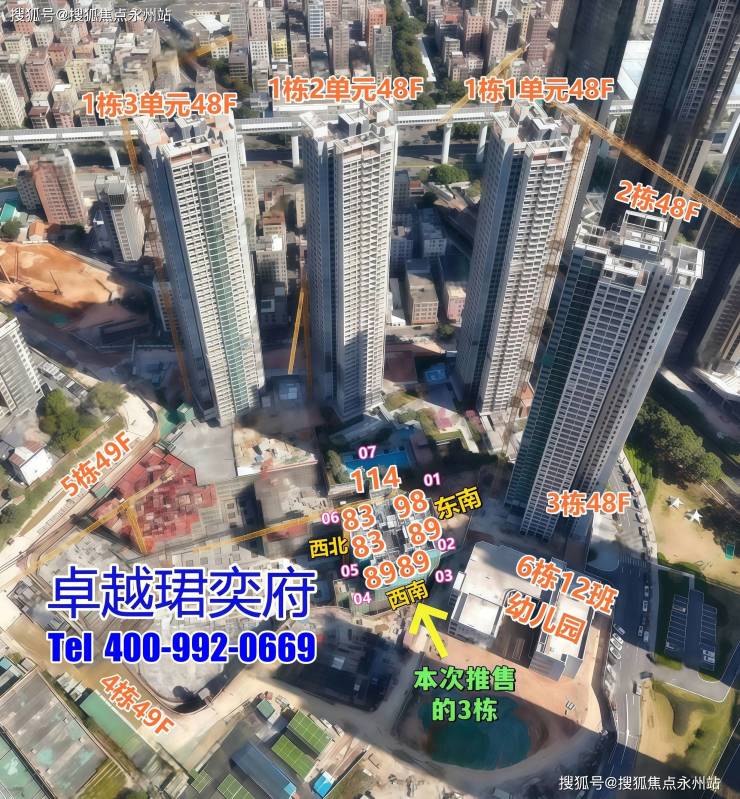 本次加推的3栋,83平朝西北向,跟4栋楼间距较远;89平朝东南向或西南向,看规划学校或幼儿园的视野;98平朝东南向;114平东南对西北,前后看花园景观。