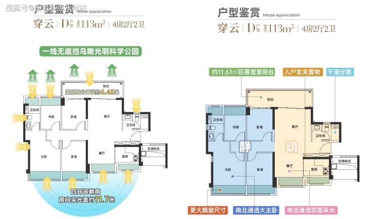 户型解析・精装四房王牌・113-114㎡全能四房南北通透:双面采光,7.1 米宽厅 + 270° 景观阳台,部分户型可改五房。