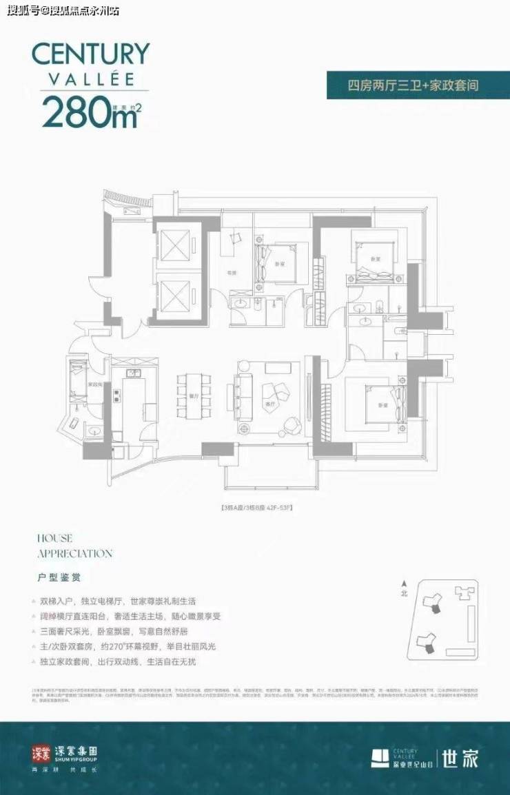 280㎡四房两厅三卫+家政套间:生活仪式感,从走进电梯已经发生。双梯独立电梯厅入户,充分保障私密,彰显主人身份之尊荣。超宽全景阔绰横厅直连阳台,三面采光让业主享受到开阔的景观视野,主/次卧双套房,270°环幕视野,将自然城市景观由此引入室内。