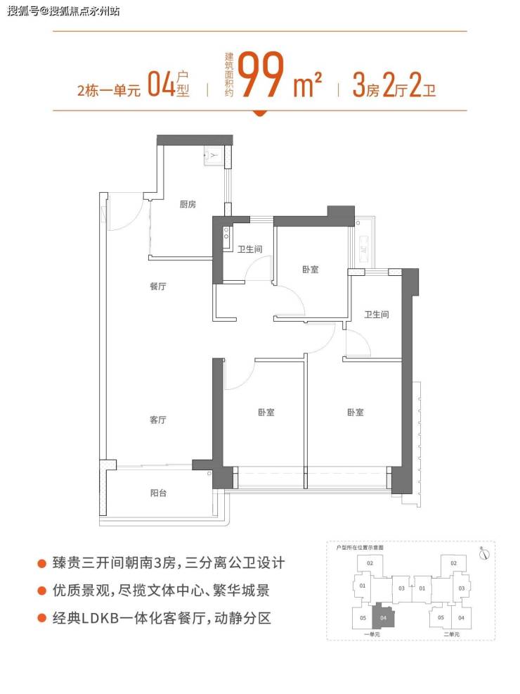 首推房源位于2栋一单元和二单元,3梯5户,总层高44层,建面约88㎡三房一卫,96-99㎡三房两卫,102㎡三房两卫。