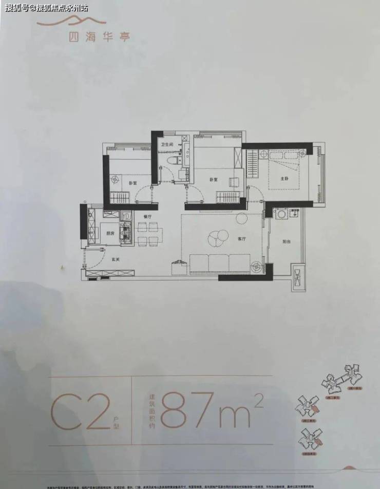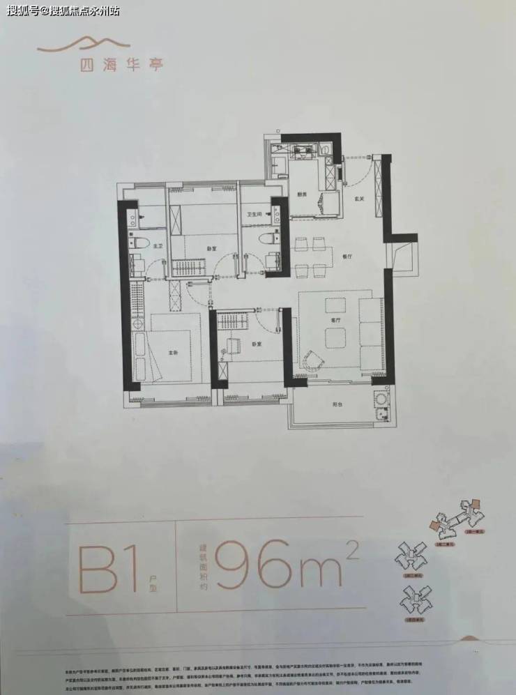 96平的有3个户型,B1、B2、C3,三个户型基本上布局差不多,大同小异,户型亮点,三个卧室均带大飘窗。