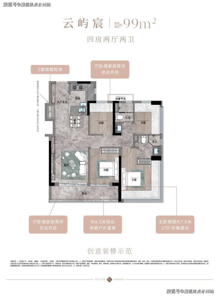 建面99㎡4房2厅2卫,传统竖厅:作为这次推售的主力户型,可以说是“刚需上车4房的最优解”。同样延续三开间朝南、LDKB 一体化设计,客厅连接次卧打造9.37㎡大阳台,洗衣晾晒与休闲观景两不误。4个房间满足多孩家庭或三代同堂需求,主卧270°飘窗+设备平台赠送,得房率(含赠送)直逼100%,让“小面积住出大尺度”成为现实。
